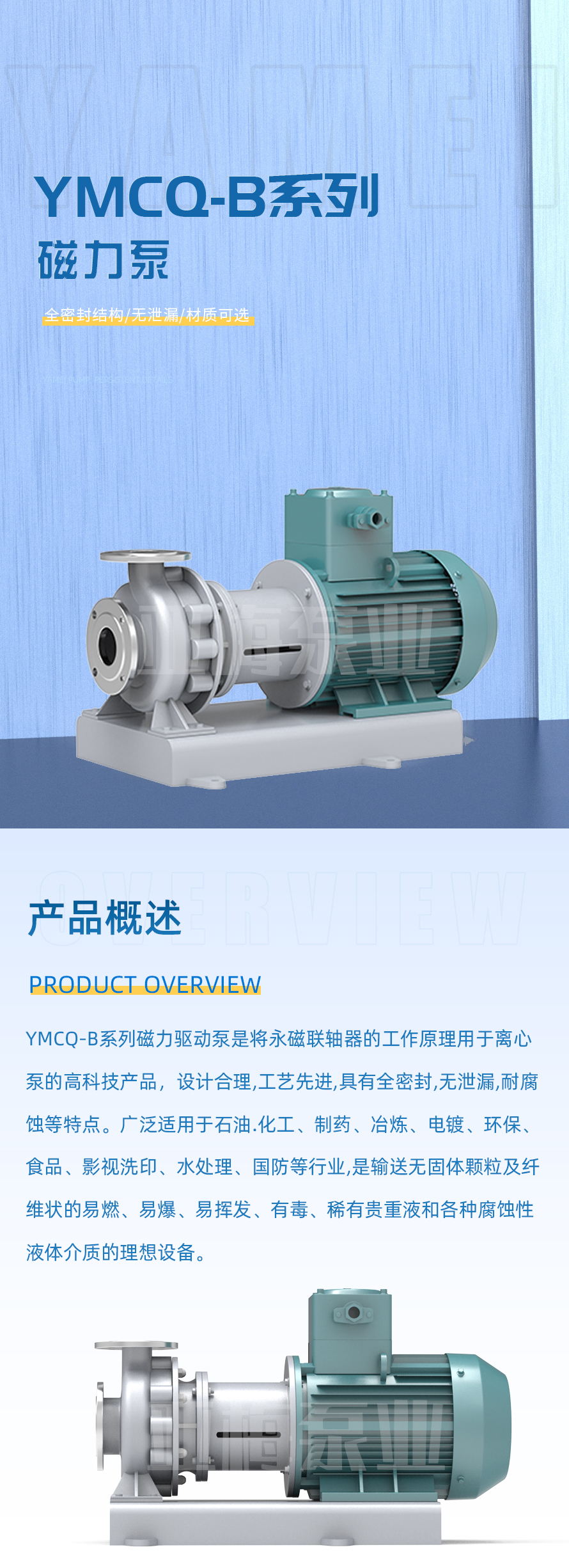 YMCQ-B系列磁力驅動泵是將永磁聯軸器的工作原理用于離心泵的高科技產品,設計合理,工藝先進,具有全密封,無泄漏,耐腐蝕等特點。